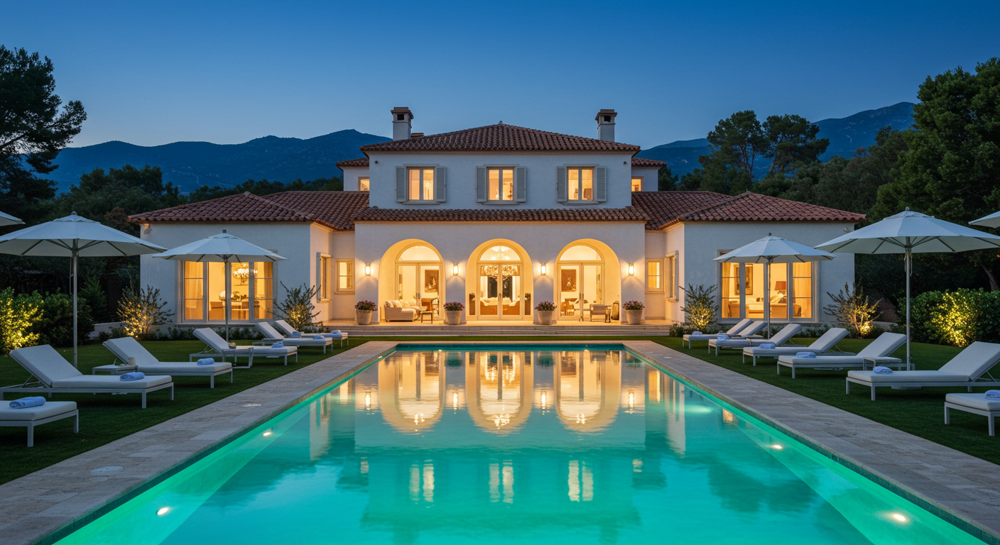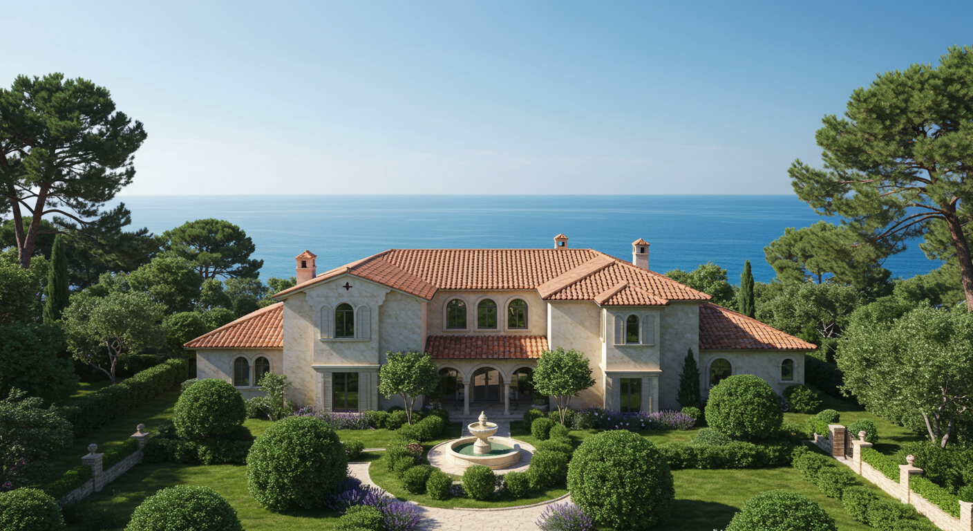 The compound evokes classic European elegance. Stone-covered structures with antique terra-cotta roofs set amid gardens and courtyards overlook the Pacific Ocean.